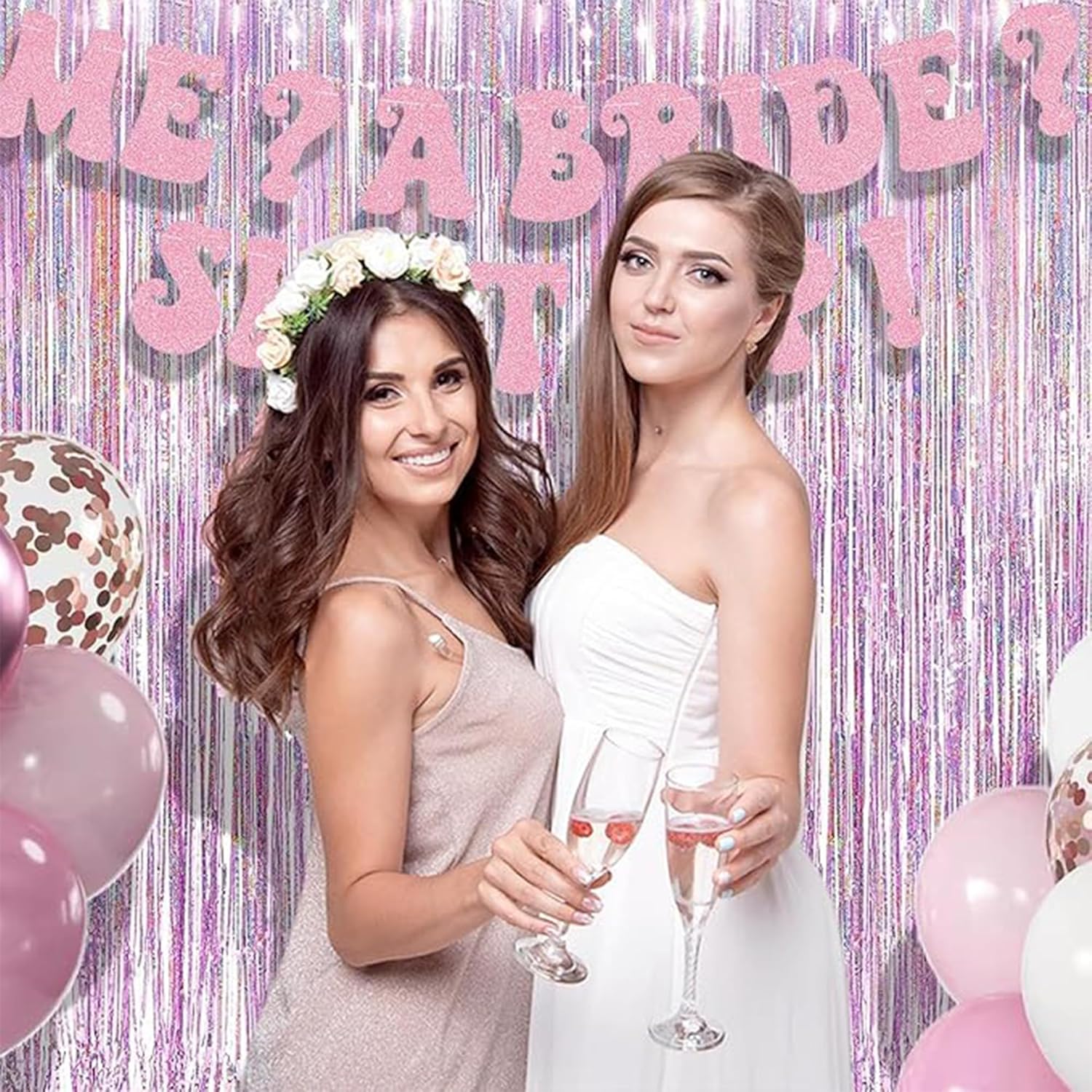 BRAVESHINE Pink Streamers Tinsel Foil Fringe Curtains - 2Pcs 3.2x8.2ft Metallic Photo Booths Backdrop for Girl/Princess/Birthday/Bridal Shower/Engagement/Bachelorette/Boo/Halloween Party Decorations
