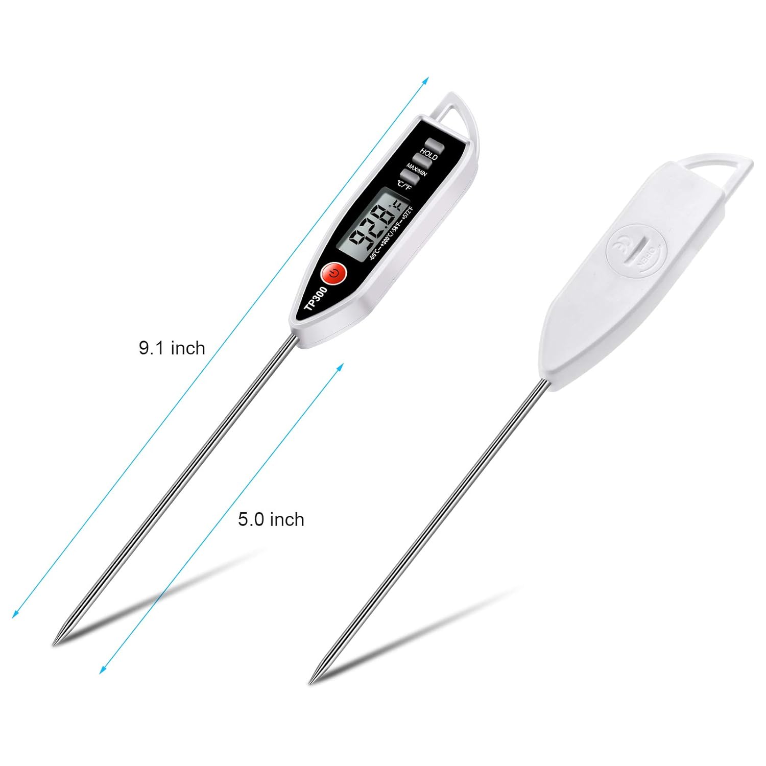- Cooking Thermometer have 5" long food grade 304 stainless steel probe prevent you from getting hot on your meaurements, and there is hook on the handle end to let you hang it on a kitchen hook