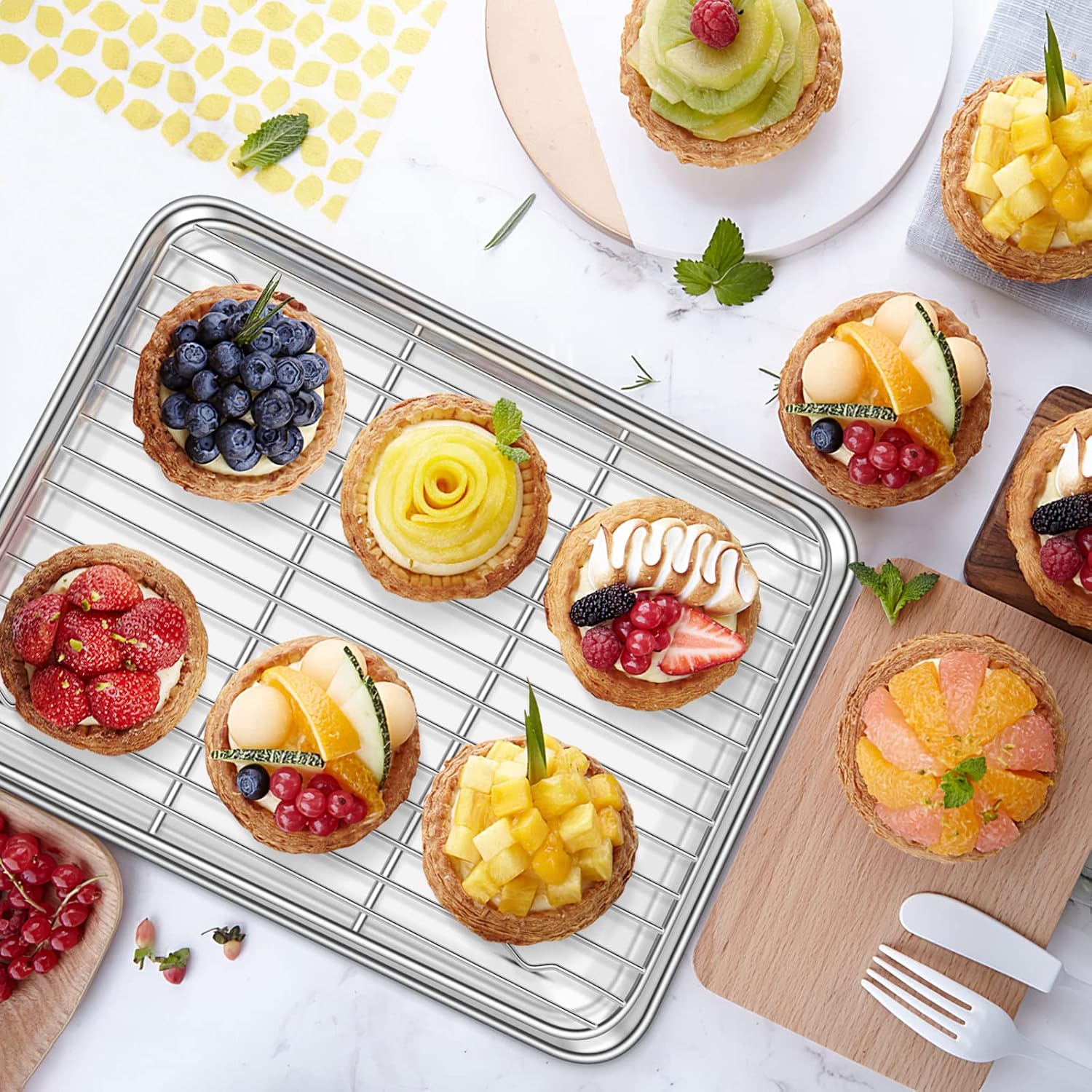 - 🍈 [ENJOY HEALTHY BAKING] Deedro baking sheets and baking racks are constructed with pure stainless steel without any toxic substance or chemical coating, PTFE, PFOA, BPA and rust free. You needn't worry about coating flaking off or noxious material leaching into your food, great substitution of aluminum pan, healthy and safe for daily use.