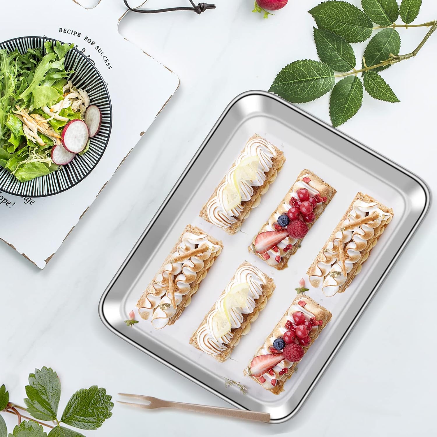 - 🎄【CLASSIC SET FOR BAKING】You will get 4 pieces, including 2 baking sheets - 10.43 x 8.07 x 1 inches and 2 cooling racks - 9.72 x 7.32 x 0.67 inches, apply to regular oven and toaster oven. Sheet pans are used for baking and cooling rack set can be used separately or together since the cooling rack fits perfectly into the half sheet pan.