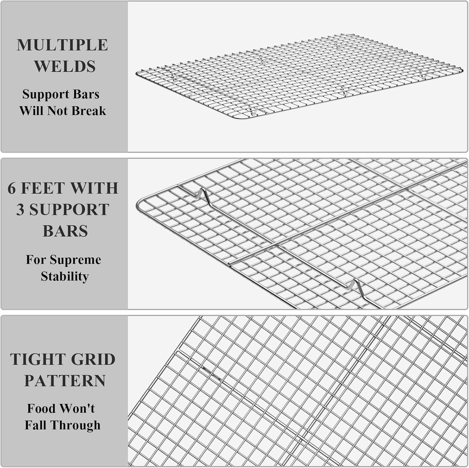 - 🎀 [SOLID CONSTRUCTION] Thick gauge with sturdy construction, these heavy-duty half sheet pans have a reinforced, rolled edge that provides extra strength to help resist warping in the oven. The cooling racks with raised feet facilitate air circulation for evenly baked goods. Feel sturdy and solid in hands, durable for serving many years.
