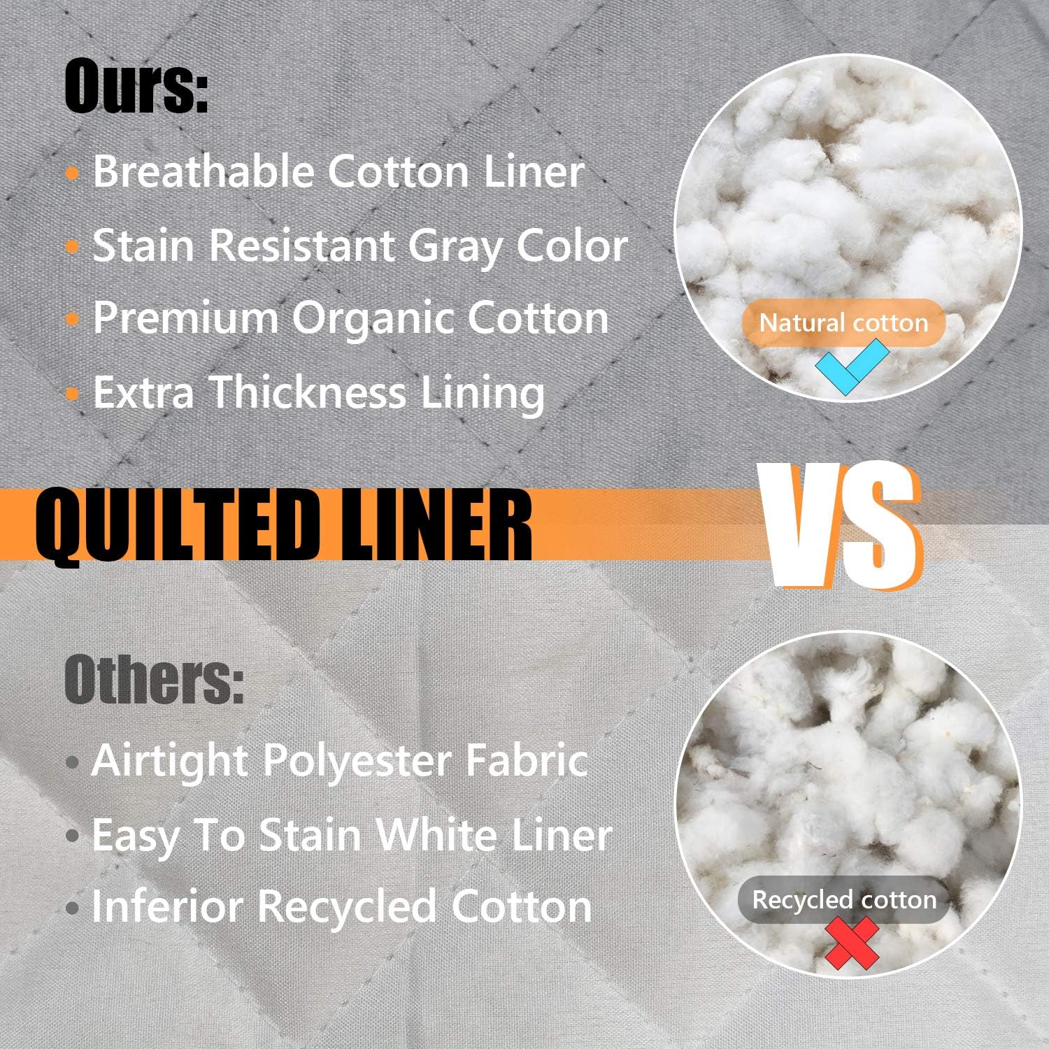 - Unlike other oven mitts using recycled cotton, our mitt's quilted liner is made of premium natural cotton and offers great control and comfort without sacrificing dexterity. It provides good protection and comfortable touch for your hand till your forearm and has good stain resistant thanks to the gray color liner fabric design.