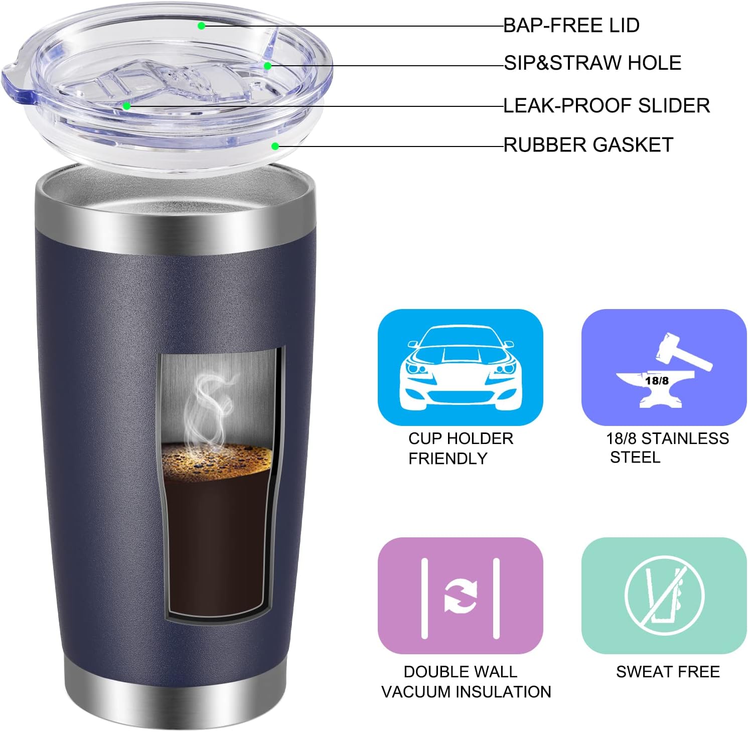 - 20oz Coffee Tumbler : the 20 ounce drink tumblers’ body height is 6.6", the Drink-through lid diameter is 3.4". It fits most car cup holder and ideal for use over a long period of time. Perfect for all-day outdoor events, conferences, business trips,commute and the like