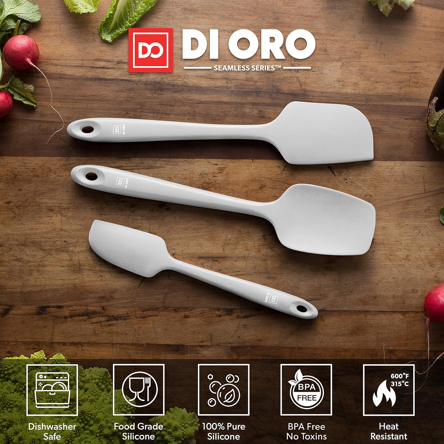- ONLY THE BEST – Each piece in the DI ORO 3-Piece Seamless Silicone Spatula Set is made with BPA Free and LFGB Certified Silicone. Built to withstand the heat, each spatula is heat-resistant up to 600°F, which means you will never melt your favorite spatula.