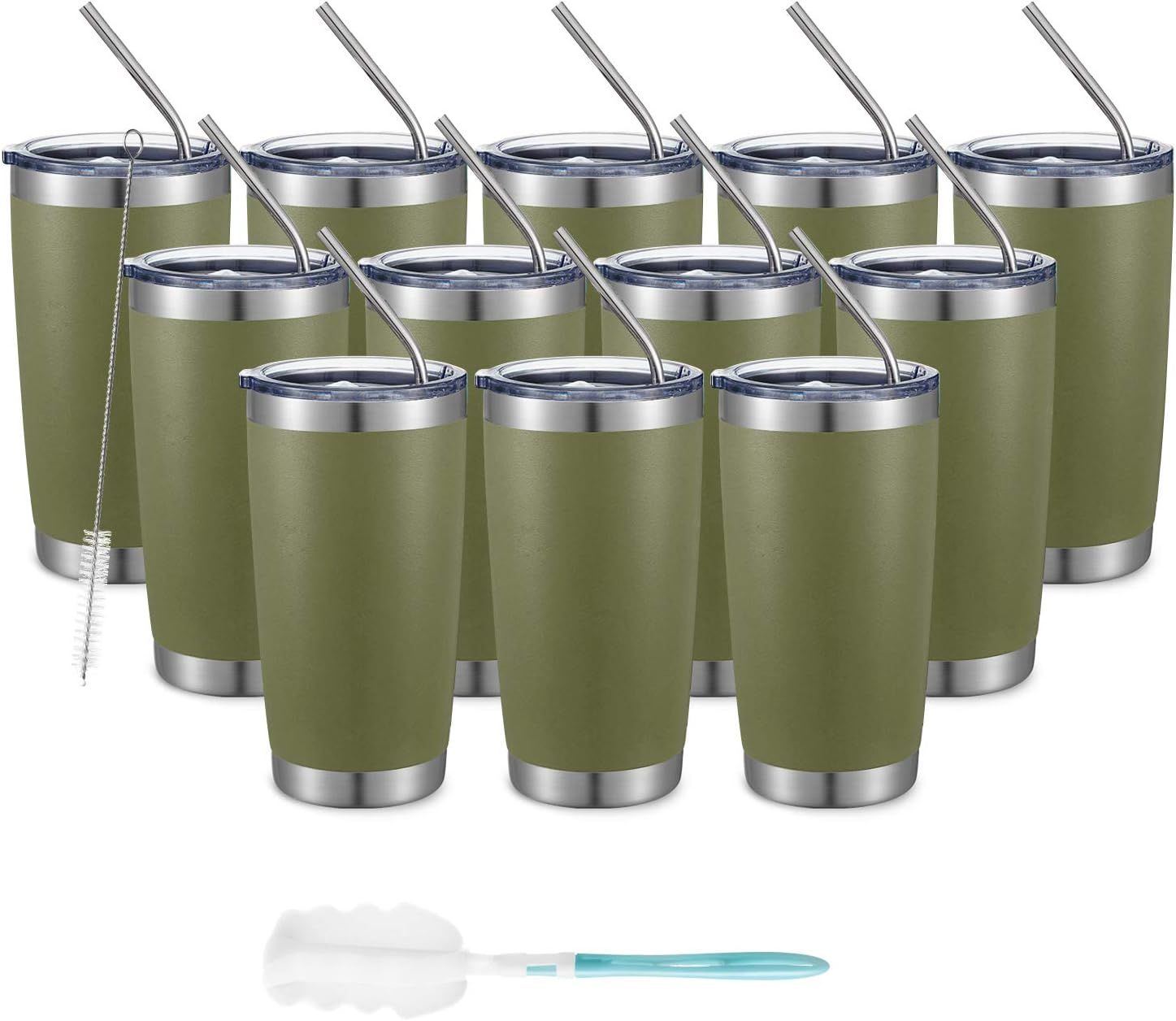 COMOOO 20oz Double Wall Vacuum Insulated Travel Mug, Stainless Steel Tumbler with Lid and Straw Durable Powder Coated Insulated Coffee Cup for Cold & Hot Drinks (Army Green, 12 pack