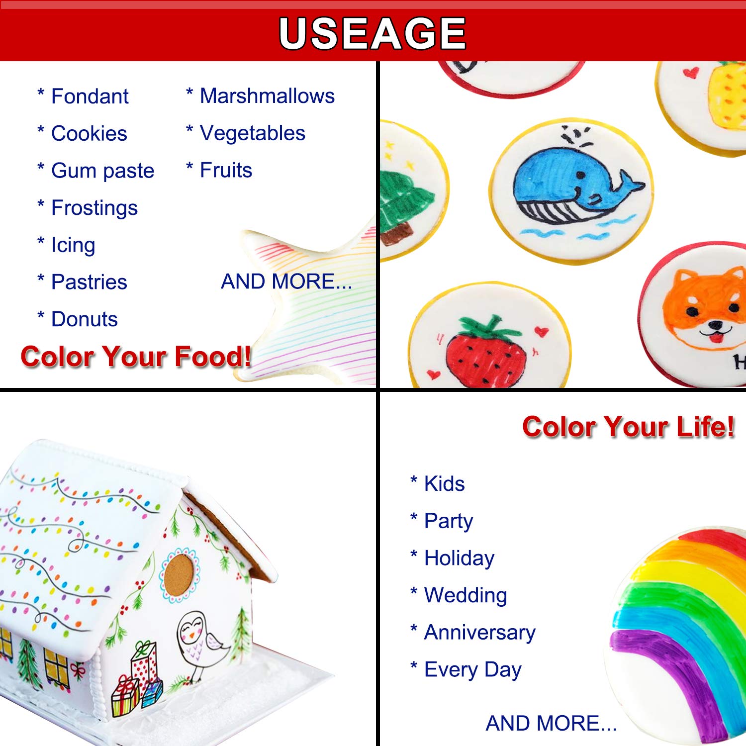 - [Widely Use] Edible Marker can be used on most of smooth dry surface. Including Fondant,Cookies,Frostings,Dried Royal Icing, Marshmallows,Donuts,Pastries and more.(Not suitable for wax surface)