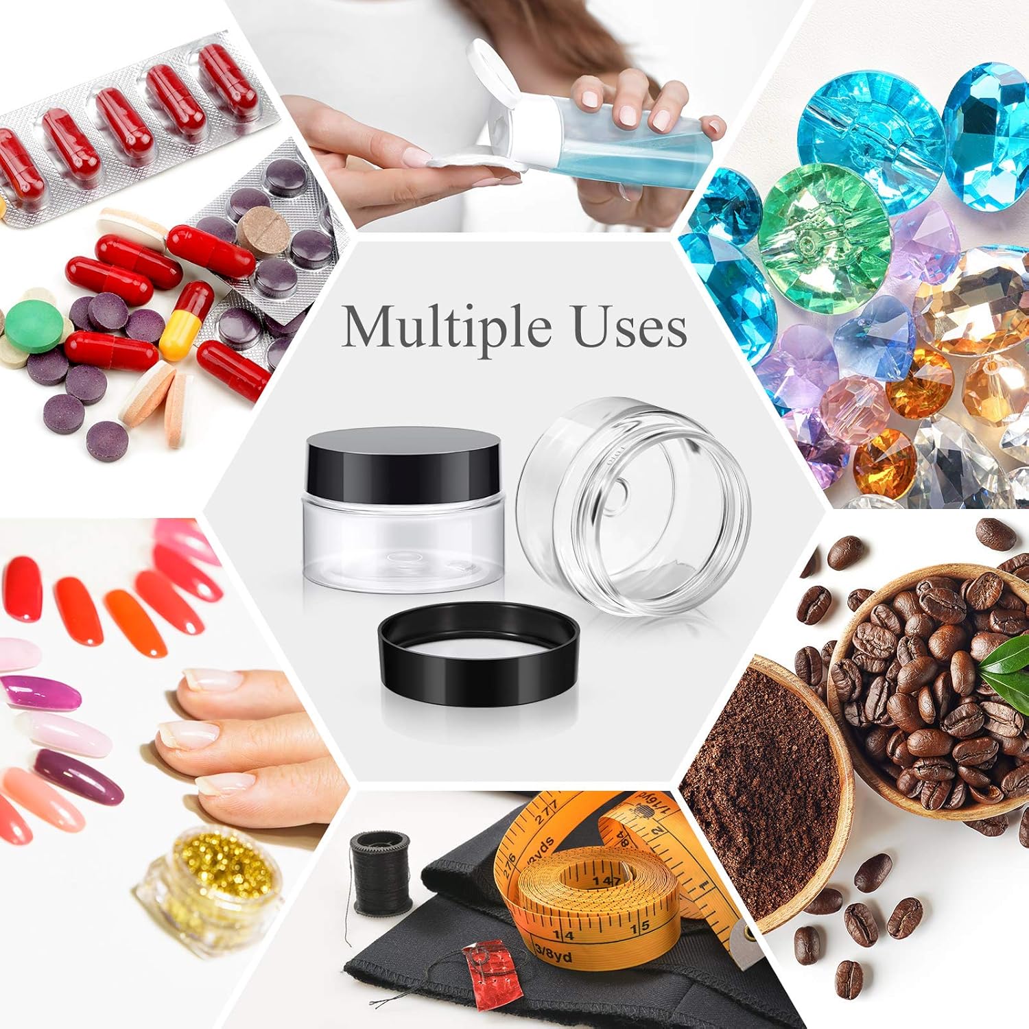 - What you receive: there are 4 pieces plastic jars with black screw-on lids. They are reliable and refillable, measuring about 1oz in capacity
