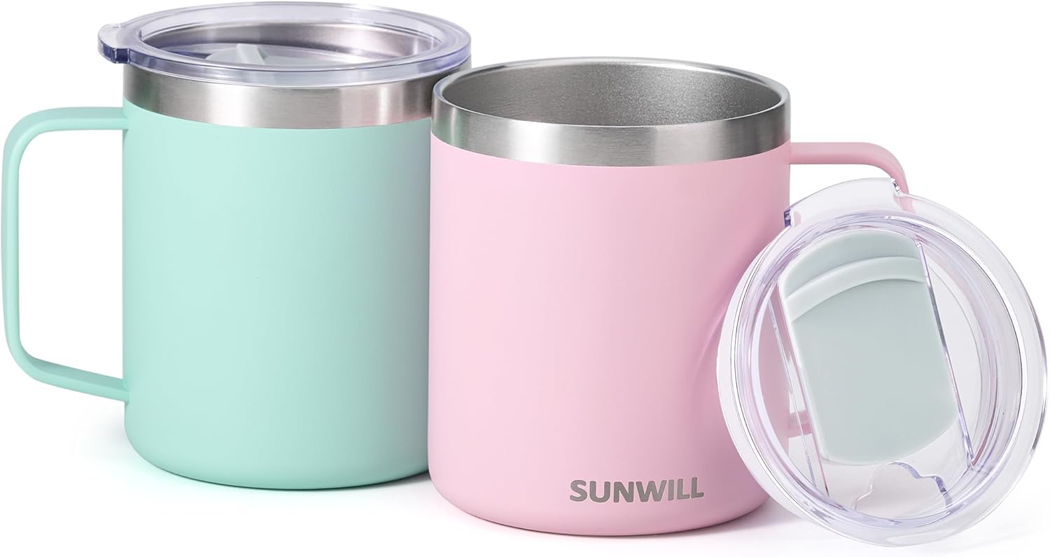 SUNWILL Travel Coffee Mug with Lid, Insulated Tumbler with Handle, 14 oz Stainless Steel Cup Set for Camping, Outdoor, Powder Coated Sakura & Mint 2 Pack