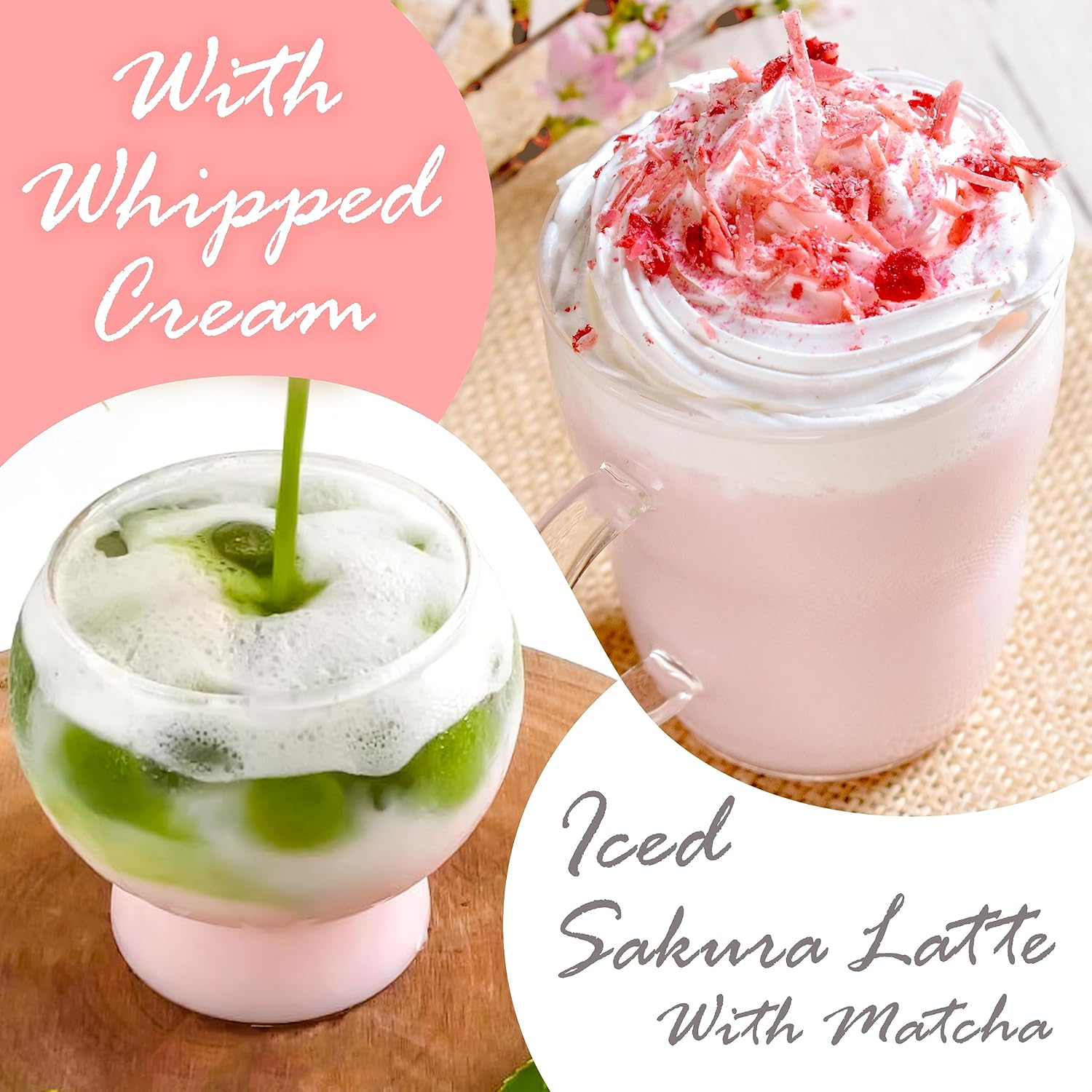 - CHERISHED SAKURA BLEND – Sakura, or cherry blossoms, are a symbol of beauty and tradition in Japan. This sakura latte powder blends two iconic varieties—Yaezakura and Oshimazakura. The edible Oshimazakura cherry blossom contains coumarin, a natural aromatic compound that gives the drink a rich, sweet fragrance reminiscent of spring in full bloom.