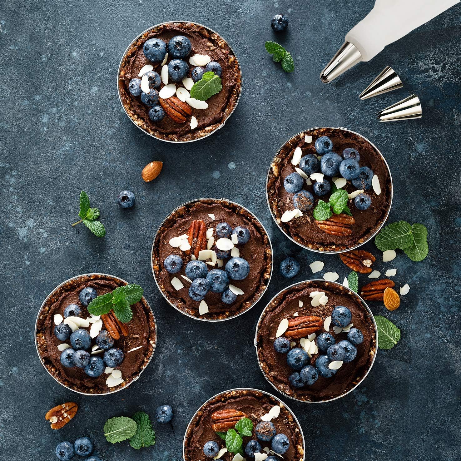 NewlineNY Stainless Steel French Pastry Tart Ring Baking Kit - 6 Perforated Round Dessert Rings + 3 Nozzles + 1 Sample Decorating Piping bag Kit