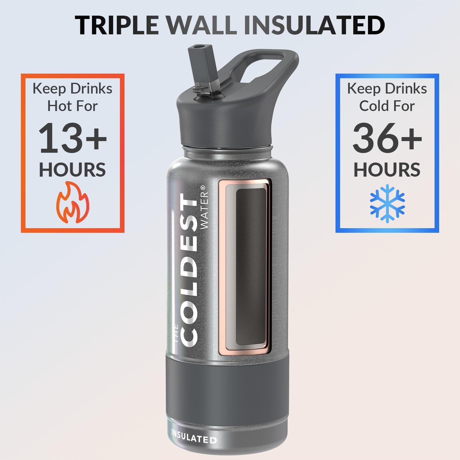 - 𝐀𝐃𝐕𝐀𝐍𝐂𝐄𝐃 𝐈𝐍𝐒𝐔𝐋𝐀𝐓𝐈𝐎𝐍 𝐓𝐄𝐂𝐇𝐍𝐎𝐋𝐎𝐆𝐘: Coldest reusable water bottles are your solution to tepid sips. With the world's first fully insulated straw lid, this bottle keeps your drink cold for 36+ hours and hot for 13+ hours, ensuring your drink stays at the perfect temperature throughout the day. Cold-tested against 50+ leading brands, its superior performance guarantees an unmatched experience. Upgrade now to the Coldest Water Bottle and bid farewell to temperature woes.
