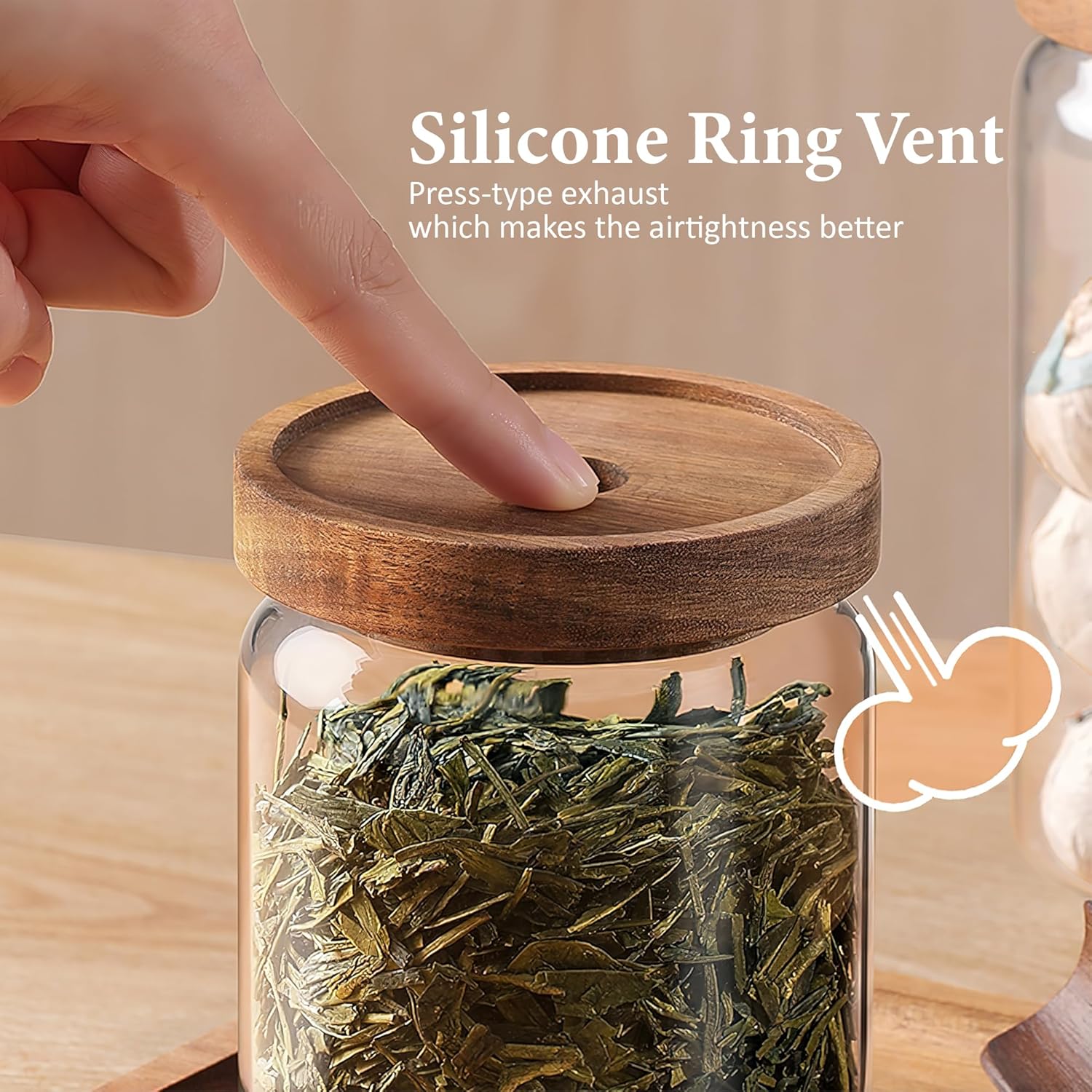 480ML/16Oz Clear Cute Glass Storage Canister Holder with Stackable Airtight Wood Lid, Modern Decorative Small Container Jar for Coffee, Spice, Candy, Salt, Cookie, Condiment, Pepper, Sugar