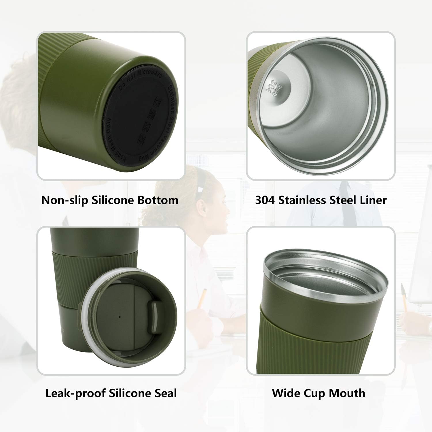 - 【Leak Proof & Non-Slip Coffee Tumbler Cup】The insulated leak proof coffee tumbler cup features a high-quality matte finish exterior with non-slip silicone sleeve that will not burn your hands, also provides sweat-proof and anti-slip properties, comfortable to touch and you are ready to go!