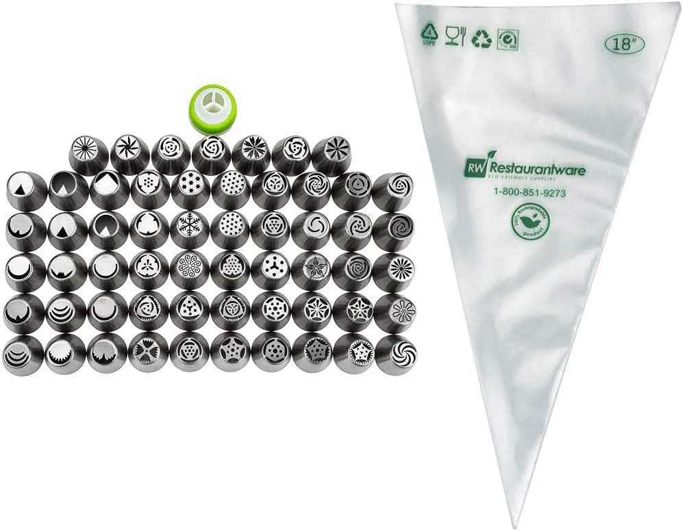 Restaurantware Pastry Tek Russian Piping Tips Set 68 Piece Durable Cake Decorating Kit - 57 Piping Tips 10 Piping Bags Stainless Steel Piping Bags And Tips Set 1 Tri-Color Coupler