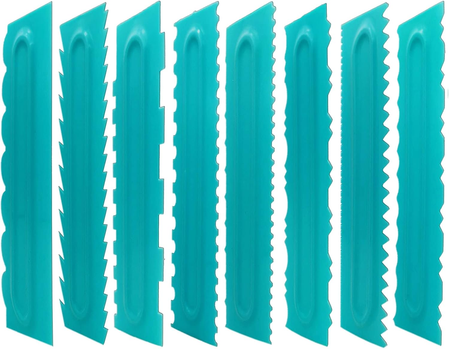 - Different Shapes-8 Pieces in 16 patterns.You will get 8 pieces of cake smoothers in total; Both sides of this cake scraper are available to use and there are 16 patterns including smooth edge for you to create different shapes of cake edges.Easily add different textures and designs to butter cream icing.