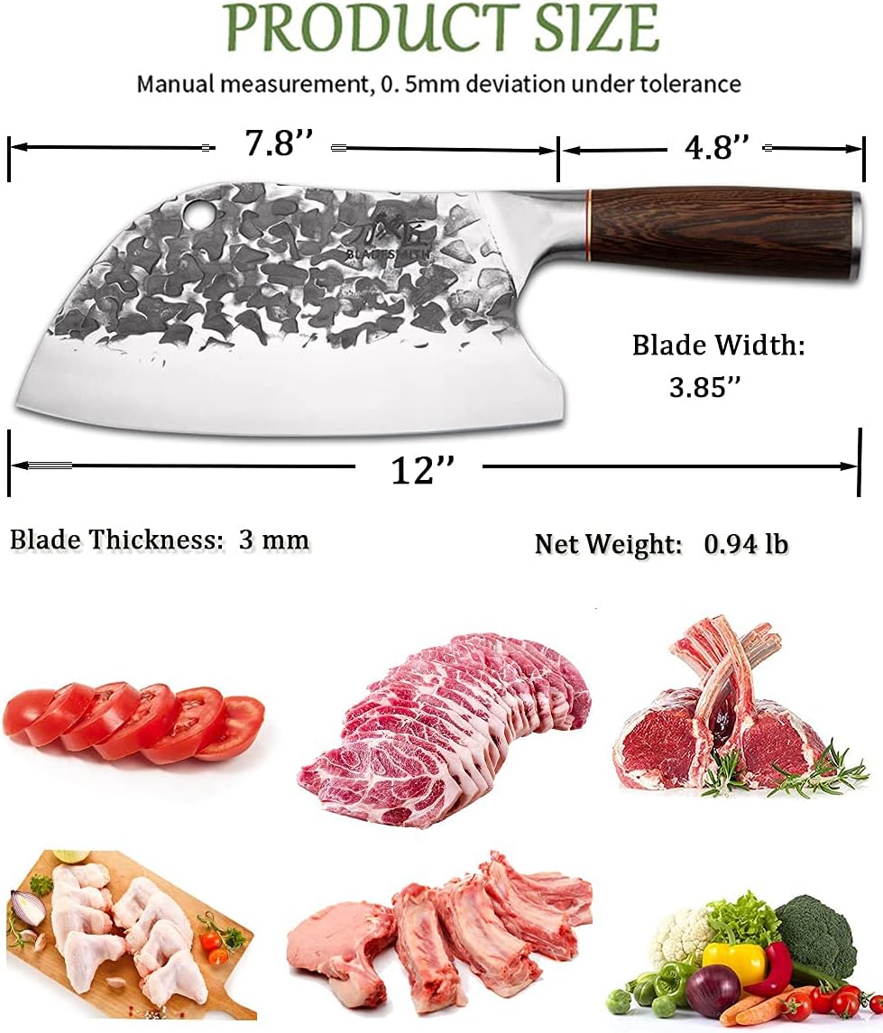 - ③ 【Exquisite Workmanship】Our knife is produced by professional workers with abundant knife-making experience. In the quenching - hammer -tempering- clamping steel - hammer -quenching- tempering and other continuous cycle operations.This operation guarantees the hardness and sharpness of this kitchen knife. If uses it correctly. You can use the kitchen knife 15--20 years.
