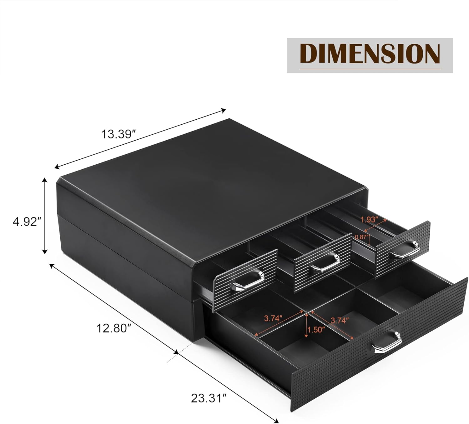 - 2 Tiers & 4 Drawers: Integrated with 3 small drawers and 1 multi-functional large drawer , this 2-tier coffee pod organizer is compatible with K-cup (up to 72 pods) & Nespresso small capsule (up to 96 pods). And the drawer opens smoothly.