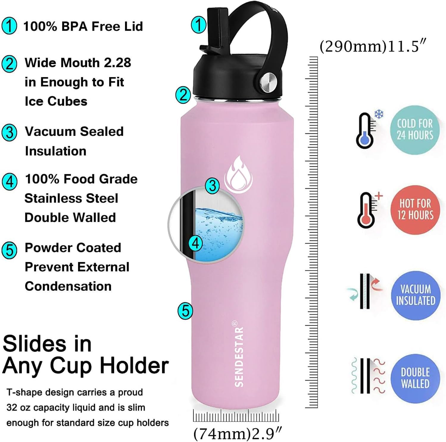 - 【FUNCTIONAL DESIGN】32oz(946ml)insulated water bottle fit any standard car cup holder comes with The non-slip layer of Powder Coating ensures you hang on to your bottle during a work out, hike or yoga.Various colors SENDESTAR is good for people of all ages and perfect companion for all activities.