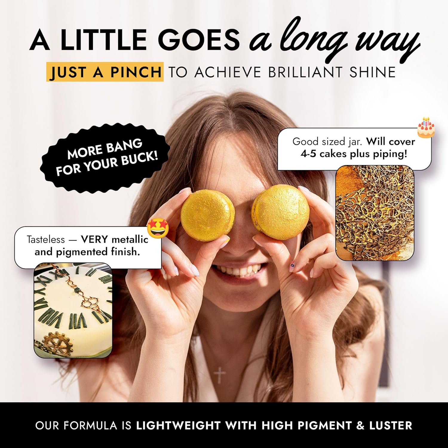 - EASY TO USE: Our gold luster dust is incredibly versatile. Apply with a wet brush, airbrush, or dry brush, and even mix into beverages. Achieve professional-looking results effortlessly at home, whether decorating cakes or adding shimmer to cocktails.