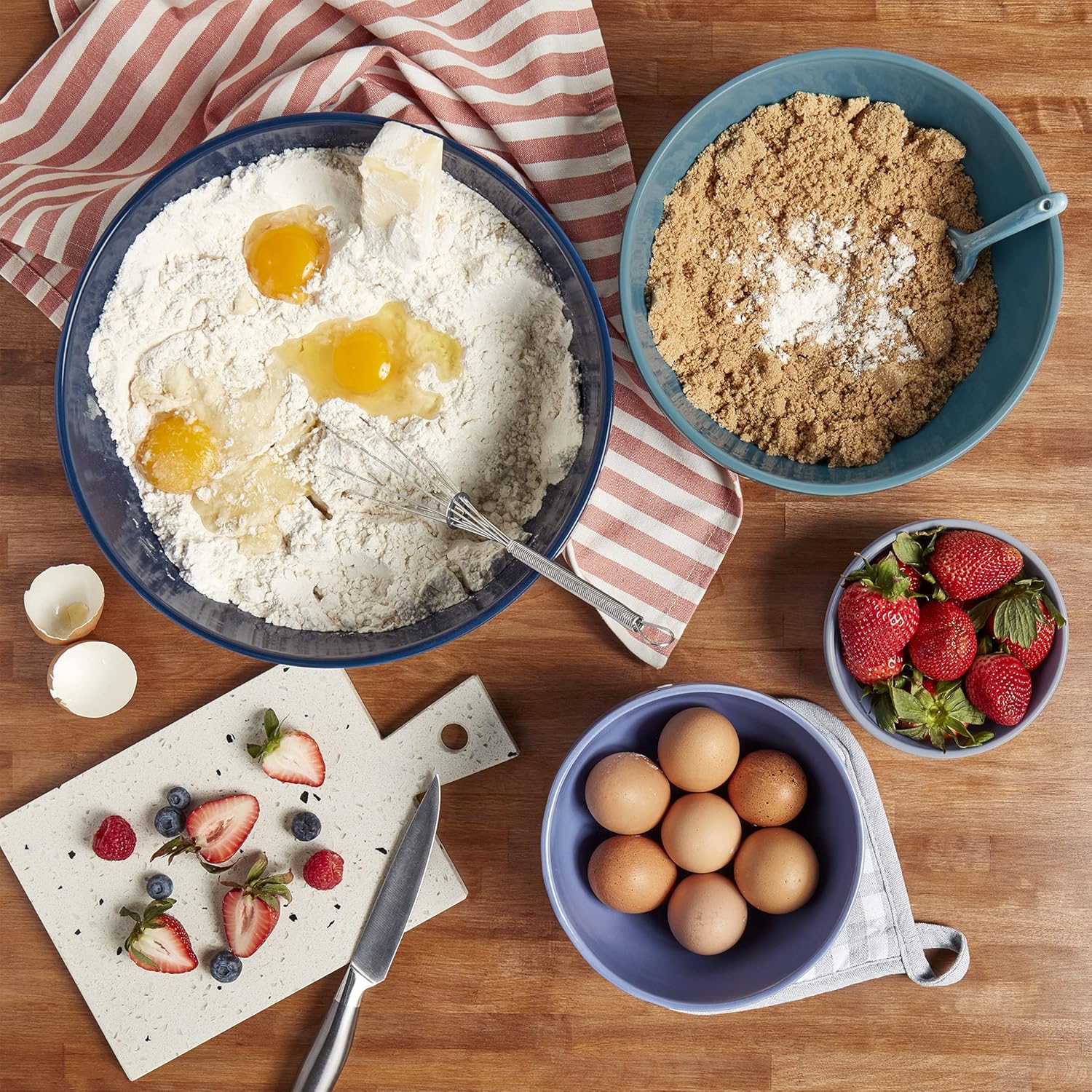 - STONEWARE MATERIAL: This 4-piece mixing bowl set is made from the finest stoneware, finished with a beautiful glaze and fired at high temperatures to create a smooth, glass-like finish. Durable, freezer safe, and microwavable, this set is perfectly designed for all of your kitchen needs.