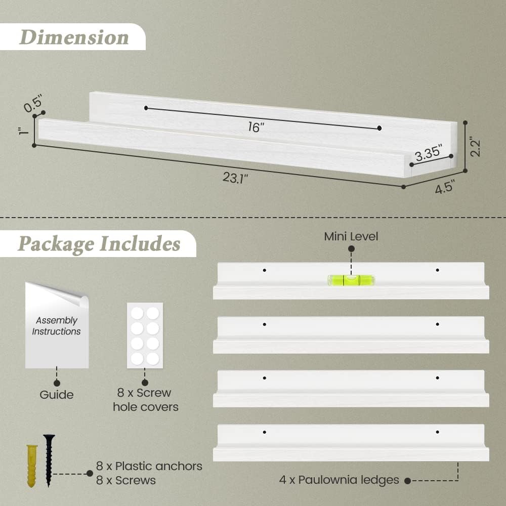 - 【Easy Installation & Breeze Disassembly】These modern & versatile nursery book shelves 24 inch come assembled in sets of 4. Easy to install those picture shelves when open carton box to hang them following instuction manual. When disassembling, just remove screws.