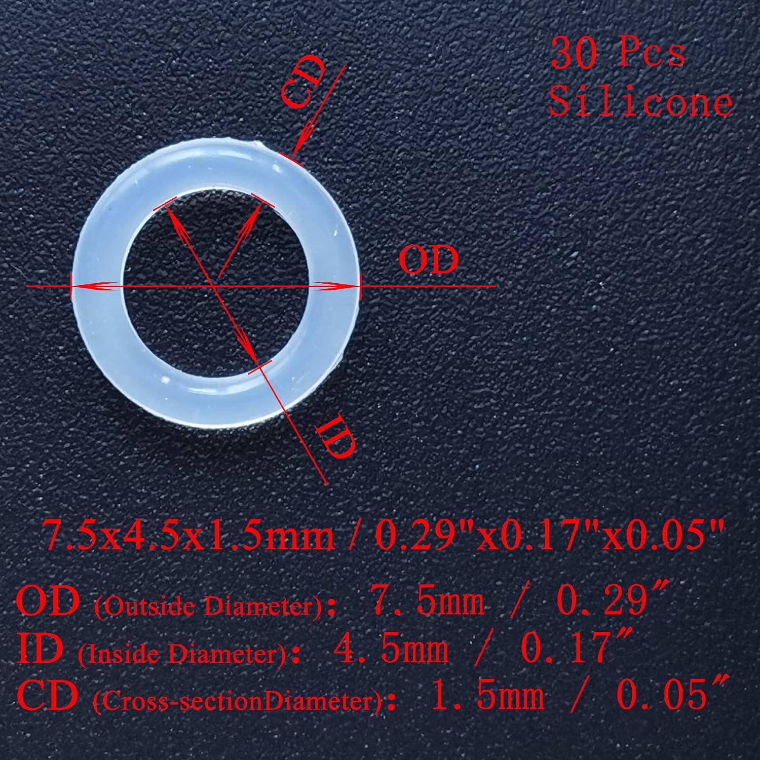 - [Specifications & Notice] - Material: Silicone(VMQ). Size: 7.5x4.5x1.5mm / 0.3"x0.18"x0.06"(OD x ID x Cross-Section Dia). Package: 30 Pcs. [Notice] - Please Confirm the Required Material and Size before purchasing, and put in the right place.