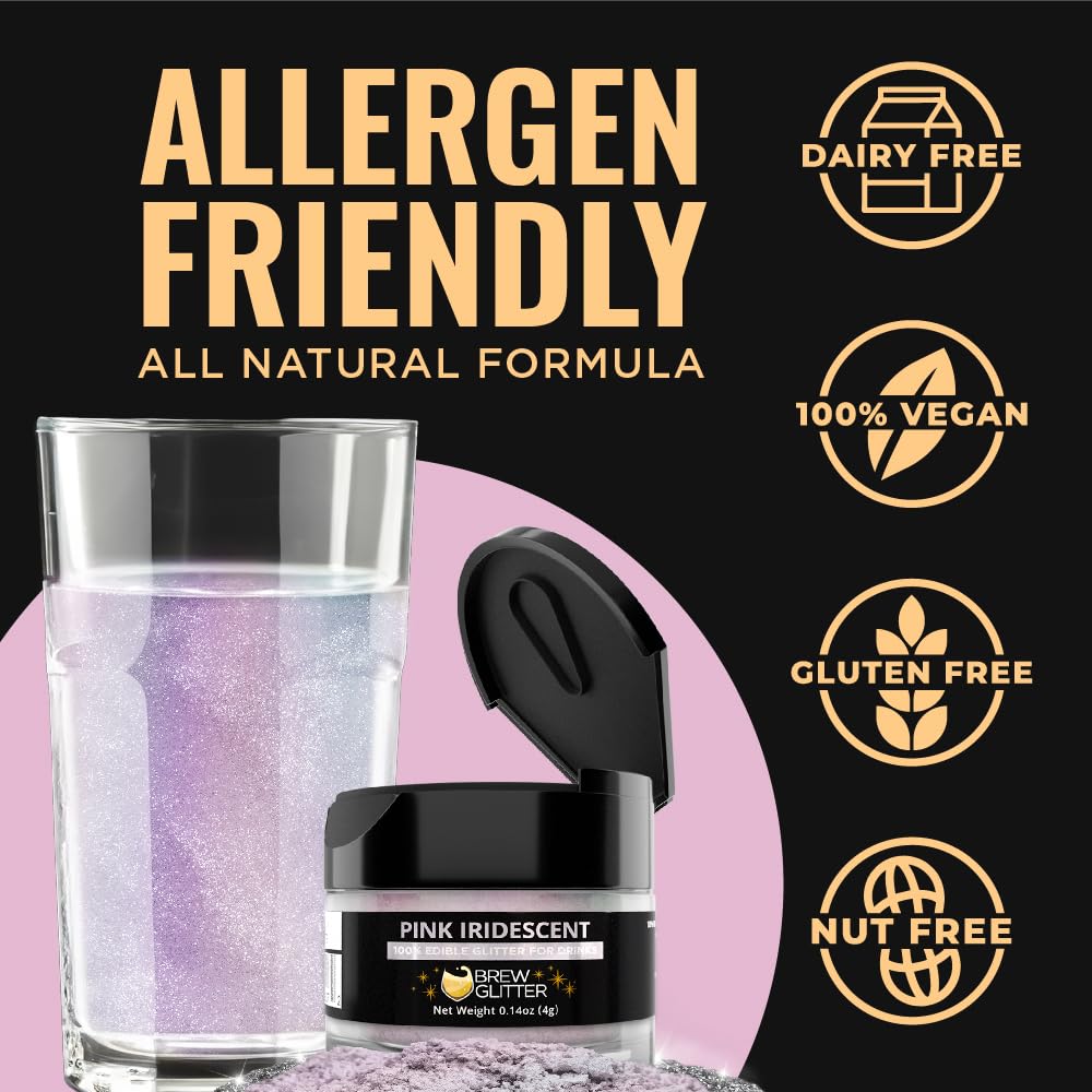 - 🌿 Brew Glitter pink iridescent drink glitter is made in the USA at SQF III, GMP, Halal, and Kosher certified facilities, and is nut-free, gluten-free, and vegan.