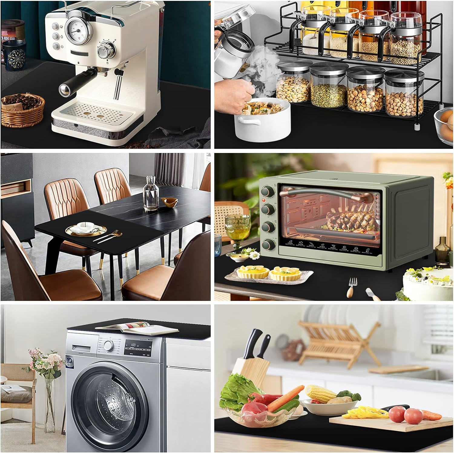 - You Can’t Go Wrong with It: This placemat can solve multiple problems. Great for catching messes. Protect counters from spills, scratches, grease, coffee stains, or damage. Place hot items of all sizes directly on the mat without having to dig through the drawer for a hot pad and no more need for trivets. Reduce the noises made by appliances. No need to worry about items slipping off the countertop. Tools will keep in place. Even if you are rolling dough hard on it, the mat won't slide