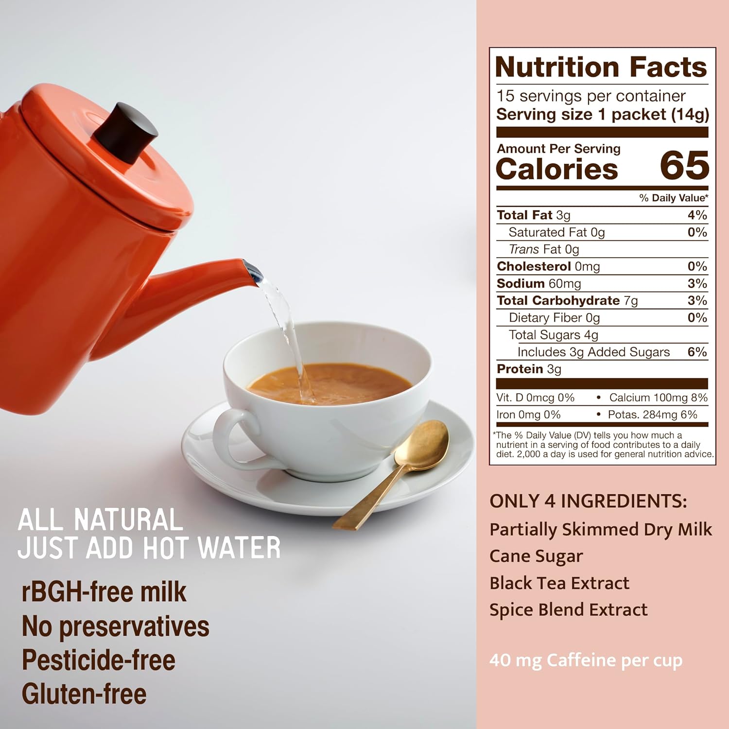 - ALL-NATURAL PREMIUM INGREDIENTS: Indulge in our commitment to purity with a blend that contains absolutely no preservatives or artificial additives. Every cup features only the finest natural components: premium black tea, quality dry milk powder for creamy texture, and a meticulously balanced blend of exotic spices. This clean formula delivers authentic taste without unnecessary additives.
