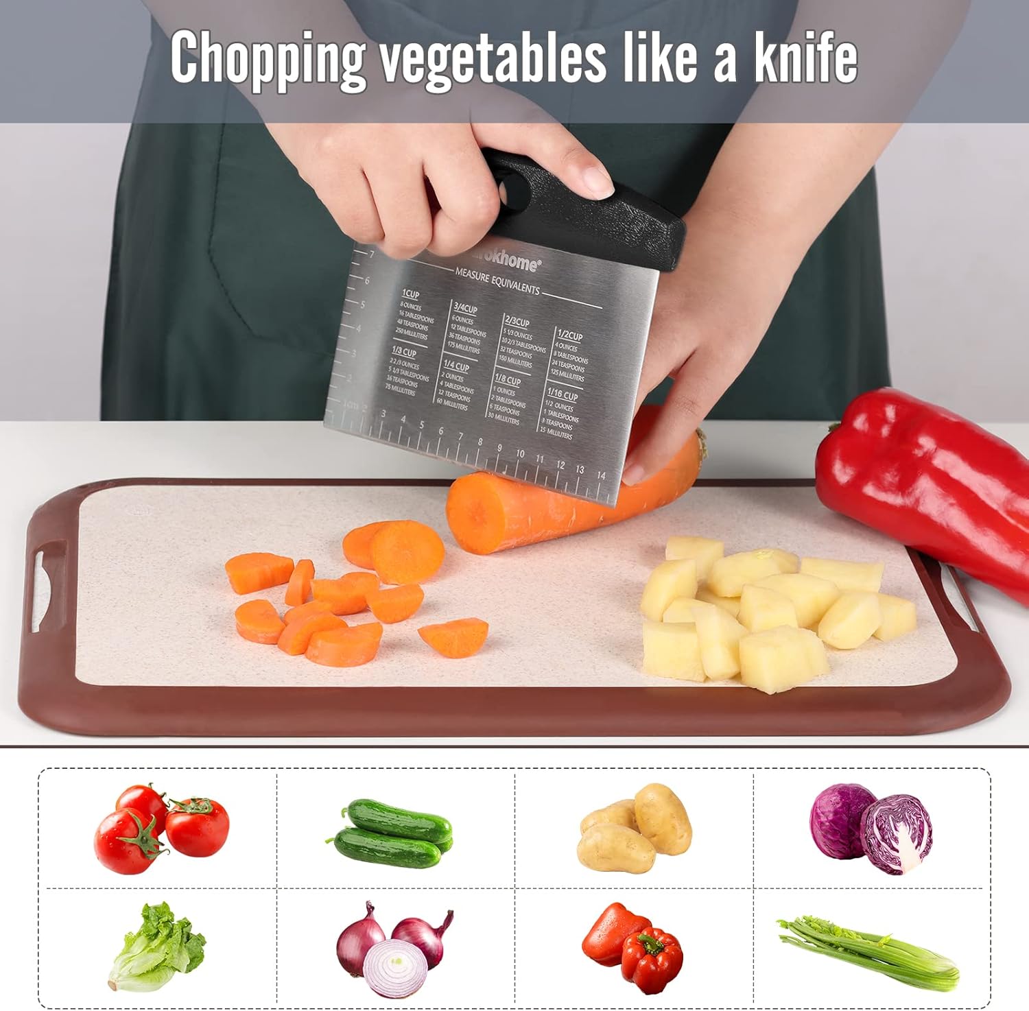 - Sharp bench scraper chopper: The pastry scraper is made from premium 430 stainless steel which is anti-rust and anti-deformation. The sharpness can stand the test of time and will give you a good clean cut for ingredients