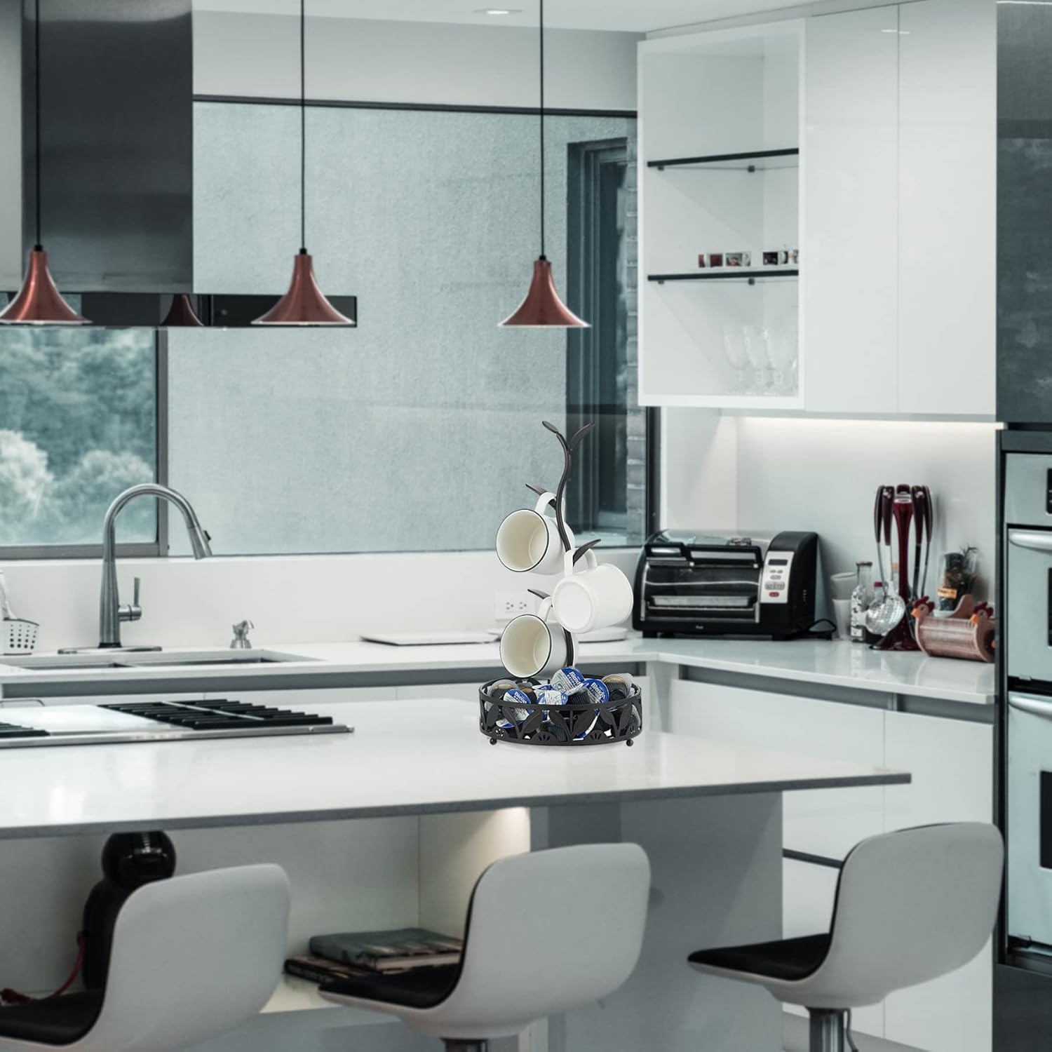 - Holds Mugs of Various Sizes & Shapes: Cups hang on the coffee cup holder by the handle, accommodating any size of ceramic or glass coffee or teacup. The leaves curve upward to keep mugs securely in place. The coffee pod holder basket at the bottom provides an extra storage space for coffee capsules, milk pods, sugar packets, mixing spoons, and even an ornament.