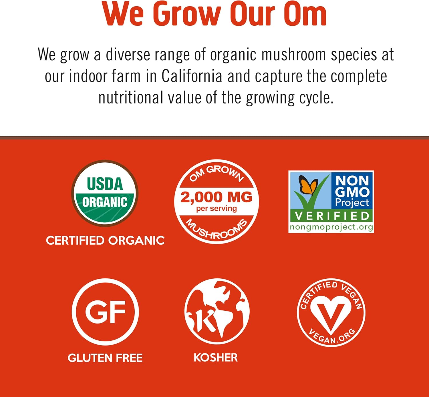 - USA Grown the Om Way: Om Mushroom Superfood Powders, Capsules, Hot Drinks, Energy Drinks and Broths are all produced in the USA. We grow, dry and mill our organic mushrooms into powders in our state of the art facilities in Southern California, to ensure the highest quality, and verify using 3rd-Party Testing. Om Mushroom functional beverages are USDA Certified 100% organic, non-GMO, gluten-free, grown in the USA, and kosher