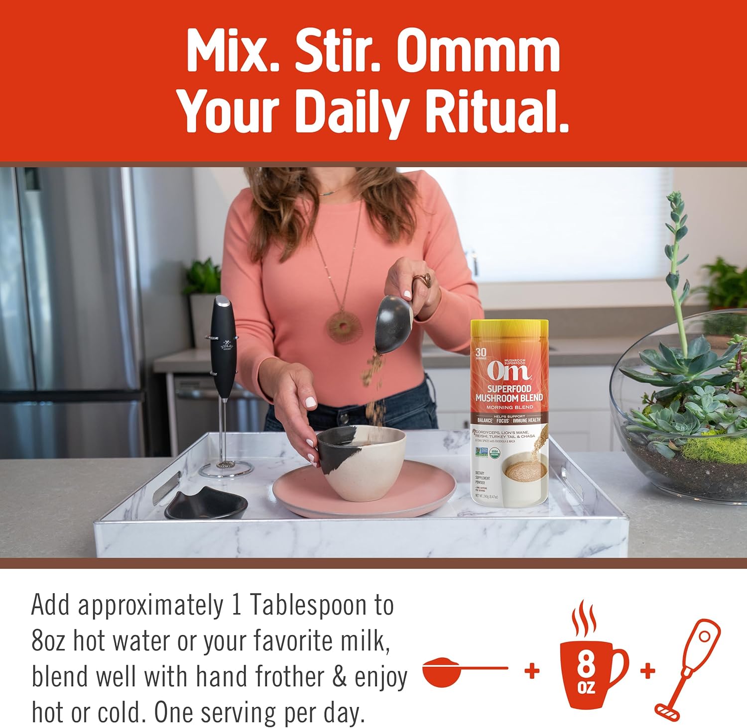 - Om Mushroom Superfood Morning Energy Blend Mushroom Powder Drink: Contains a 8.47 Ounce canister, 30 servings, of Natural Coffee-Free Energy Lift with Cordyceps, Lion's Mane, Turkey Tail, King Trumpet, Reishi and Chaga, plus Maca and Rhodiola, for a caffiene-free morning energy super blend of whole food functional mushrooms