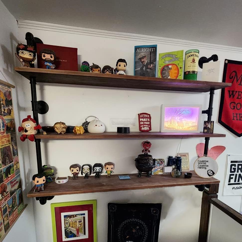 - 【Easy to assemble and hang】 Industrial pipe shelving comes with all the mounting hardware (screws and drywall screw anchor) and industrial wall shelves is mounted with four pipe flanges each with four screw holes and comes well-protected in bubble wrap. Needs a drill and smaller hammer to install these.