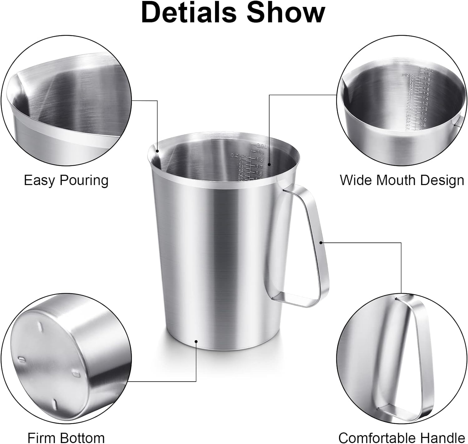 - What you will receive: the package comes with 3 pieces of stainless steel measuring cups in 3 different capacity, respectively are 16 oz (0.5 Liter, 2 Cup), 32 oz (1.0 Liter, 4 Cup) and 64 oz (2.0 Liter, 8 Cup), and designed with measuring scales on the inside, clear and easy to read, which can meet your daily use and replacement