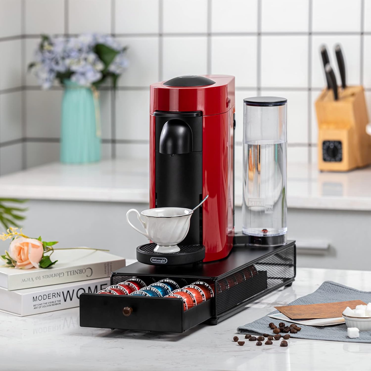 - [Space Saver] Mini Size:15.55''L*8.27''W*3.54''H. Just occupy a small corner of your counter top in kitchen or living room. In the top of vertuo capsule pods holder, the coffee machine or cup can be placed.