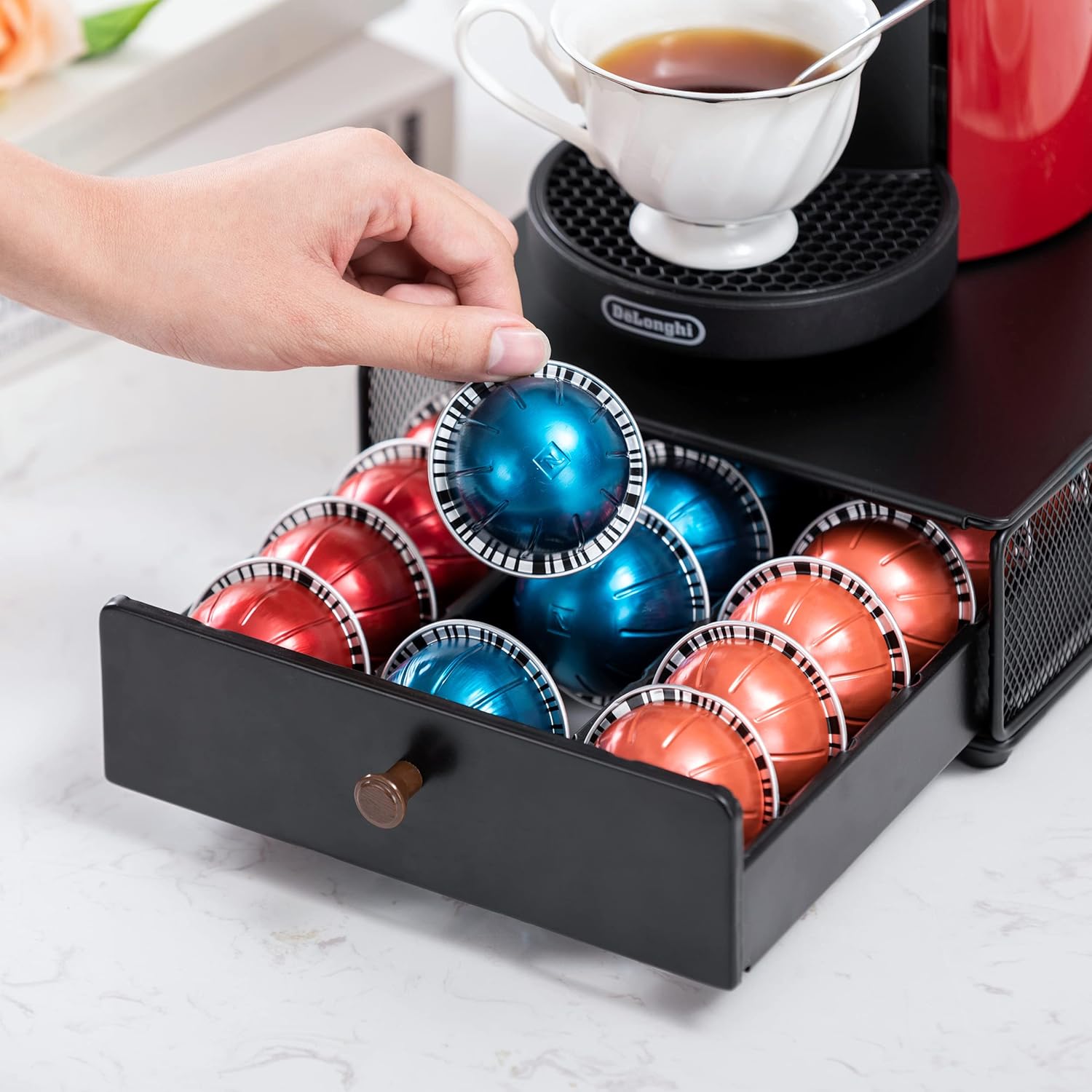 - [Save Your Time] 3 columns,10 vertuo capsule pods can be organized each columns. It can holds 3 boxes of complete vertuo capsule pods. To classify vertuoline pods of different taste and size quickly,the coffee storage drawer is your best assistant!