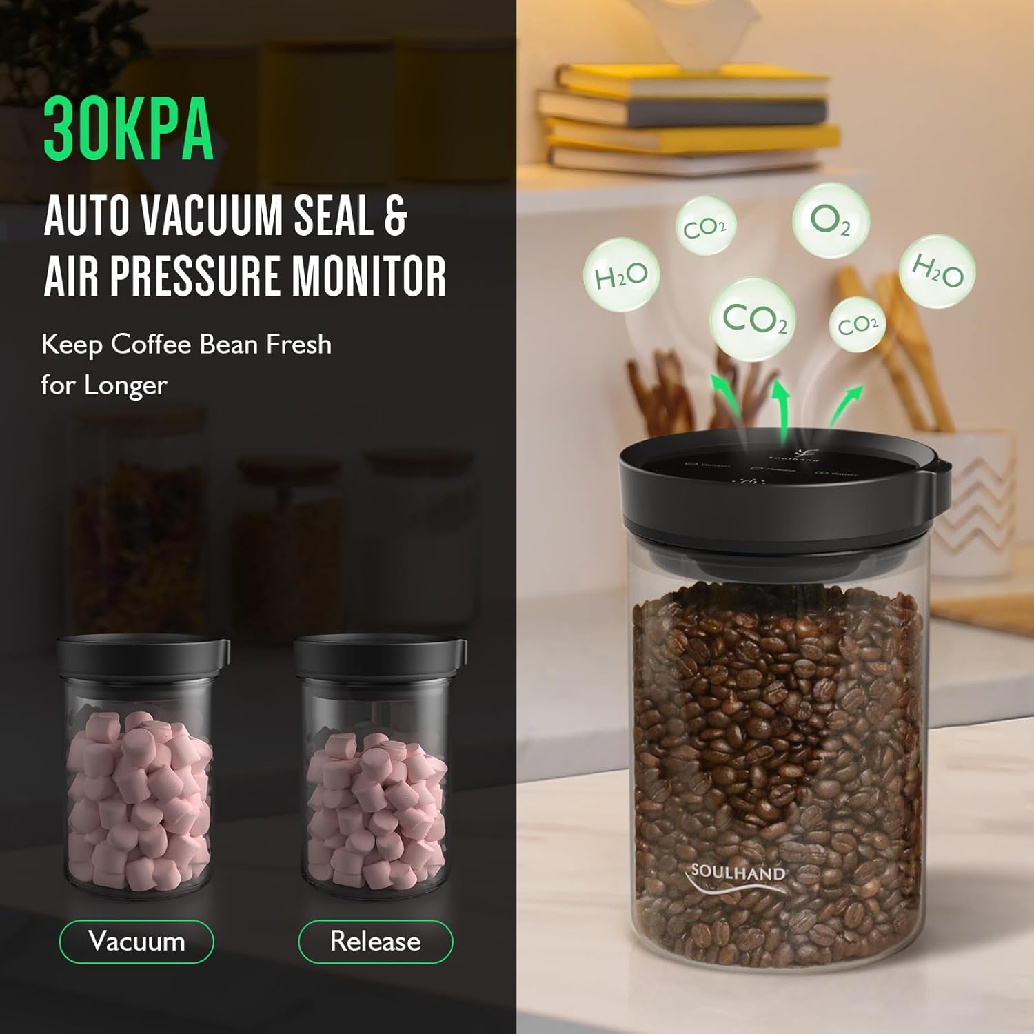 - ONE-BUTTON OPERATION & AUTO VACUUM SEAL: No need to manually twist or press to vacuum! Our coffee canister lets air in or out with a tap of twice the button. Long press the button to turn it on or off! Soulhand coffee storage container's unique automatic sealing system will constantly monitor the air pressure inside the glass jar and automatic air exhaust.