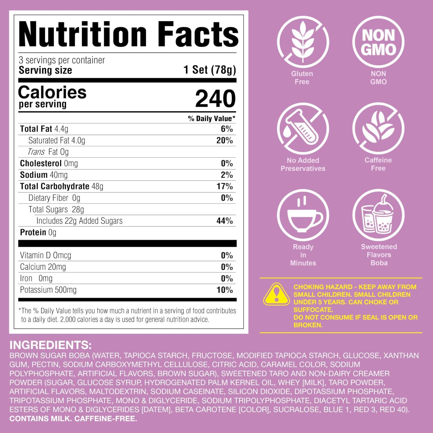 - WHAT IS INSIDE - 3 Individually wrapped portions of brown sugar flavored boba, 3 taro milk tea packets, & 3 extra wide paper straws. Store in a cool, dry place (no refrigeration necessary).