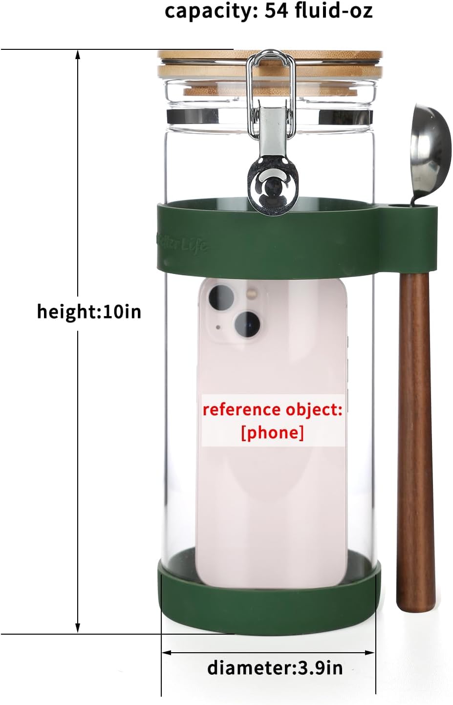 - 【Capacity:】:54 fluid ounce ( 1.5 quart) ,a 54 fluid ounce glass jar can hold up 21 oz (1.3LB) of coffee beans,can hold up 82 oz (5.1LB) of white cane sugar or sea salt,also can hold up 27 oz (1.6LB) of flour or coffee grounds.