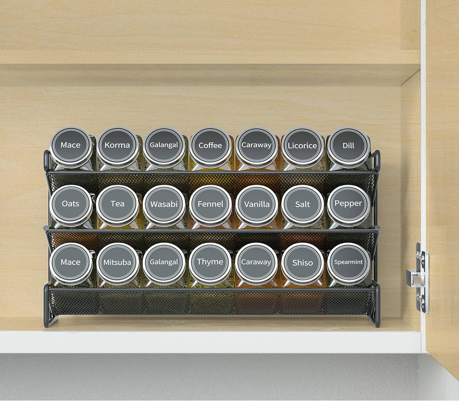 - 3 Tier Spice Rack - Made of strong steel and powder coatings electrostatic spray finished; Inclined design make it easy to locate and quickly grab what you need, turn any mess of spice into an organized masterpiece