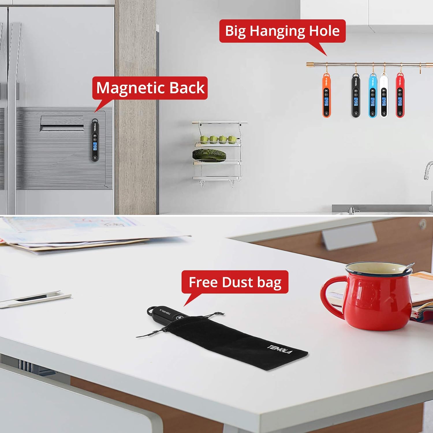 - 【Convenient Storage & Printed Temperature Guide】The cooking thermometer has a built-in magnet which makes it adsorb on the surface of household appliances easily. The hook design allows you hang on it to anywhere you want. The food thermometer comes with a high-quality dust bag, you can store all the parts together in the bag. The temperature guide is printed on the back of the meat thermometer for common meats.