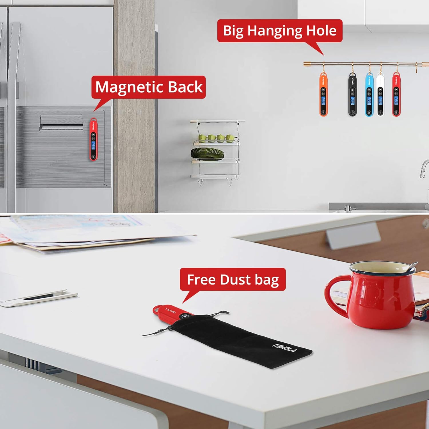 - 【Convenient Storage & Printed Temperature Guide】The cooking thermometer has a built-in magnet which makes it adsorb on the surface of household appliances easily. The hook design allows you hang on it to anywhere you want. The food thermometer comes with a high-quality dust bag, you can store all the parts together in the bag. The temperature guide is printed on the back of the meat thermometer for common meats.