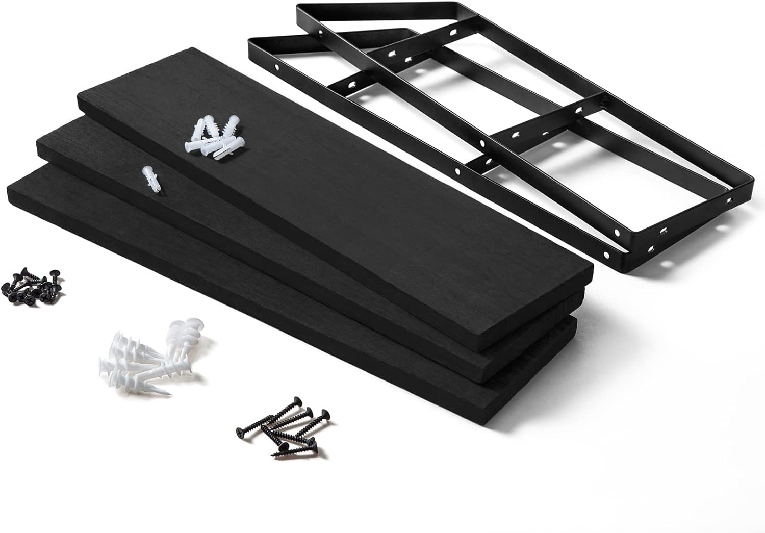 - VERSATILE 3-TIER BLACK WALL SHELF. Adds character and warmth to any modern, rustic, industrial, or traditional interior. Whether for framed photos, books, holding collectibles, toys, trophies, small plants or home décor, the Mkono 3-Tier Floating Shelf is the perfect platform for storage and display