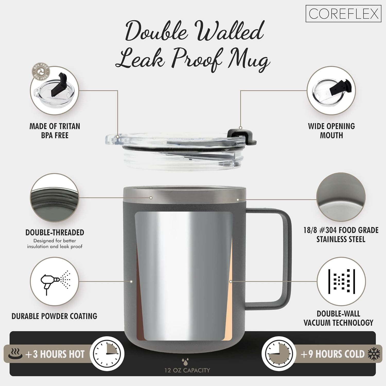 COREFLEX 12 oz Insulated Coffee Mug with Handle & Lid, Stainless Steel Double Walled Vacuum Insulated Tumbler, Travel Coffee Cup Thermal Cup - Home, Office, Travel, Outdoor, Camping