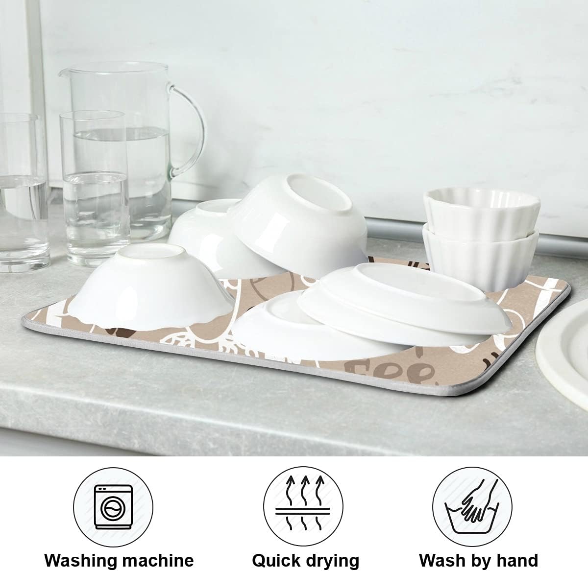 - 5【Washing intruduction】: Our Coffee mats for countertop can use machine washable, don't to worry about machine wash deformation, air dry in shade, please use mild neutral detergent.