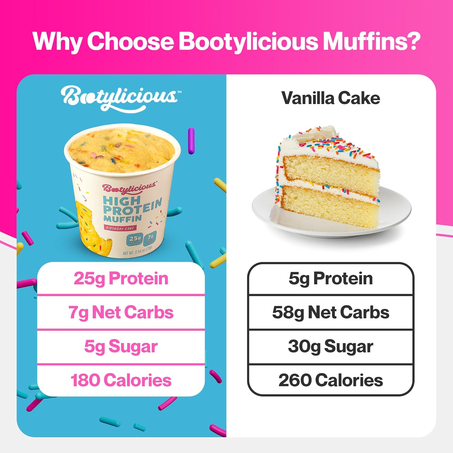 Bootylicious | High-Protein Muffin | 25g Protein, 7g Net Carbs, 2.32-2.75oz Cup, 12-Pack (Birthday Cake)