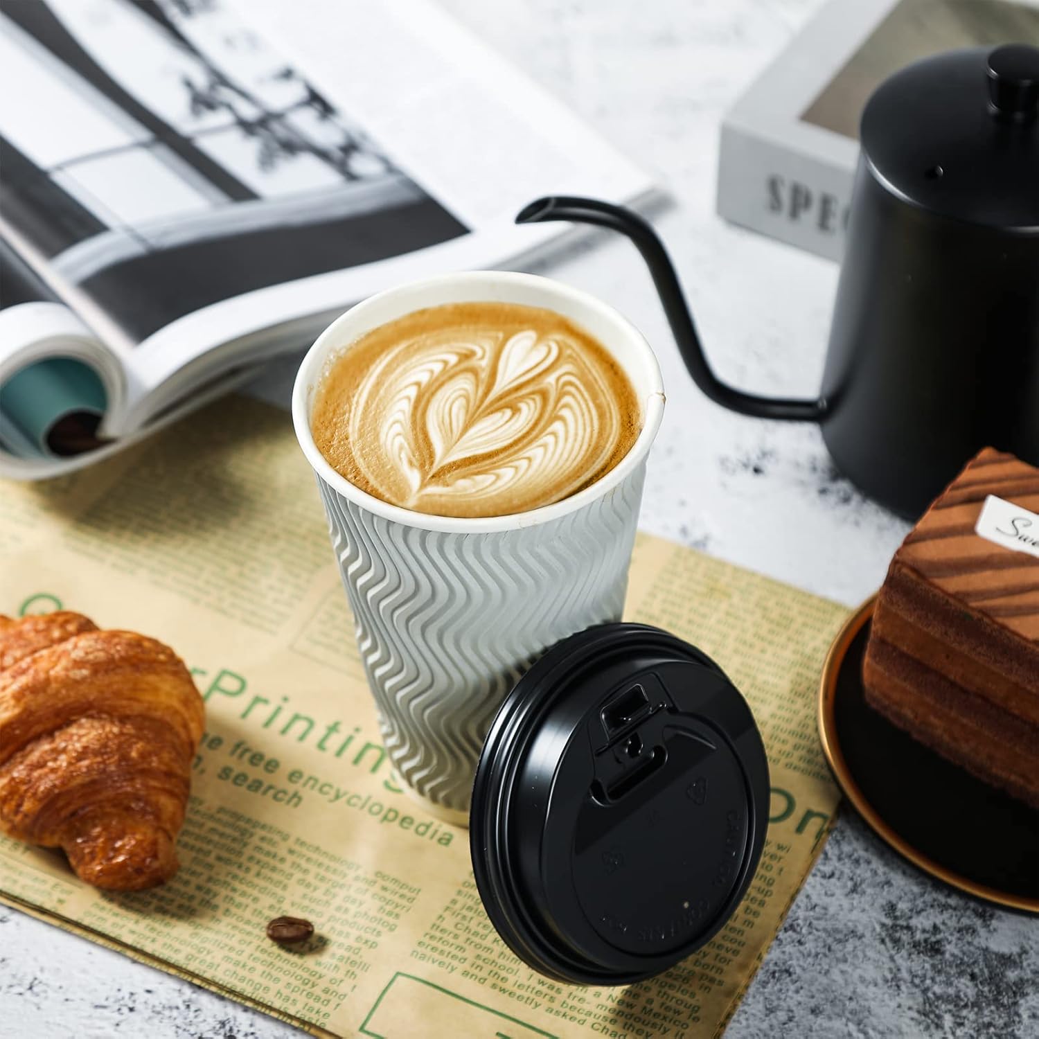 - Materials: Each disposable paper coffee cup 16 oz is made of high thickened paper. Silver grey kraft paper of outer layer is pressed out in smooth ripple patterns for non slip grip and comfortable touch. Elegance and quality coexist for one cup