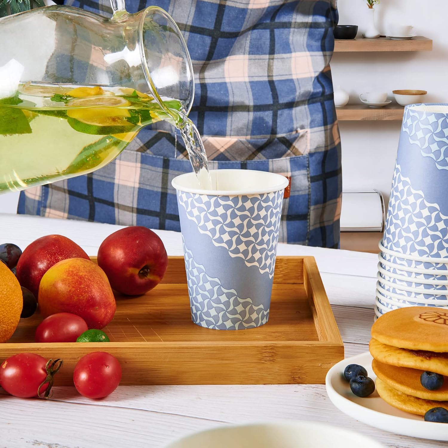 - Design: These disposable paper cups are made of made of thickened paper. The 12 oz coffee cups feature a blue pattern design, offering a minimalist look without being dull