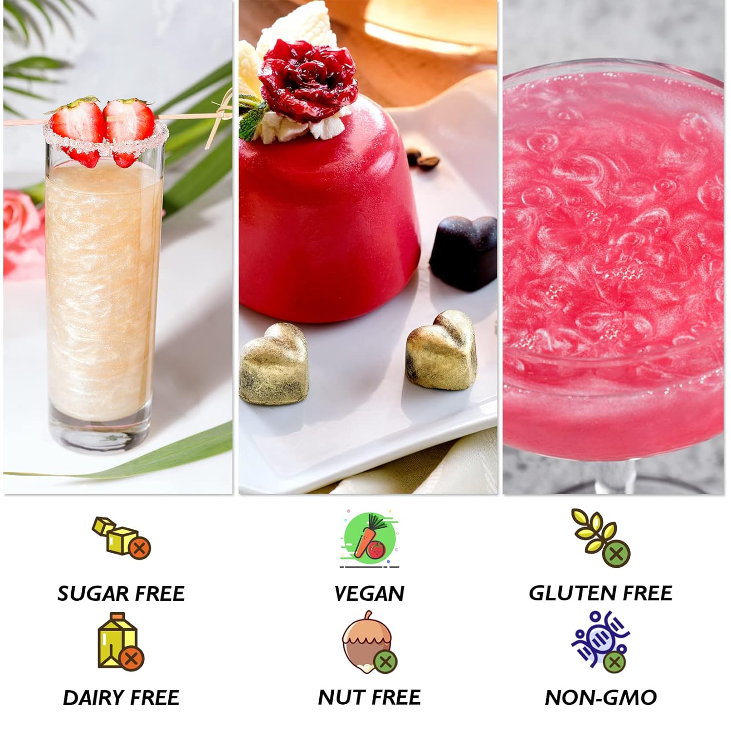 - DRINKING & BAKING: This edible glitter can be used for a various beverages and wines, cocktails, champagne; gourmet cakes; cupcakes; cookies; chocolate; mcaroon, brownies; dipped strawberries; fruit platters; ice-cream, etc.. Our products are designed in compact bags, you can put it on the corner when finished using.